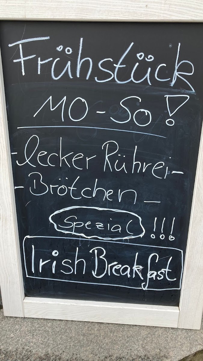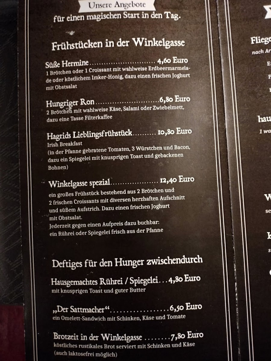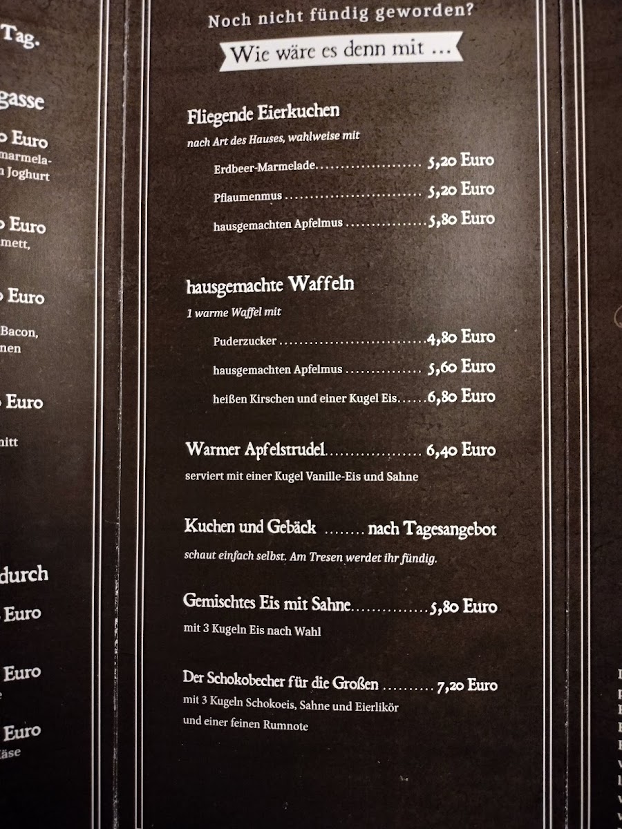 Food offerings cover breakfast dishes such as English Breakfast and Bauernfrühstück with fried eggs, as well as light meals like Currywurst with fries. Sweet options are available, including waffles, and there are menu items inspired by the local theme, such as Fliegende Eierkuchen Nach Art Des Hauses.