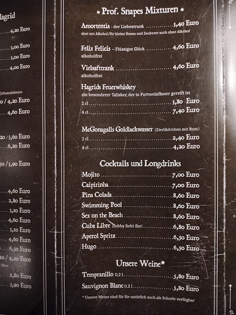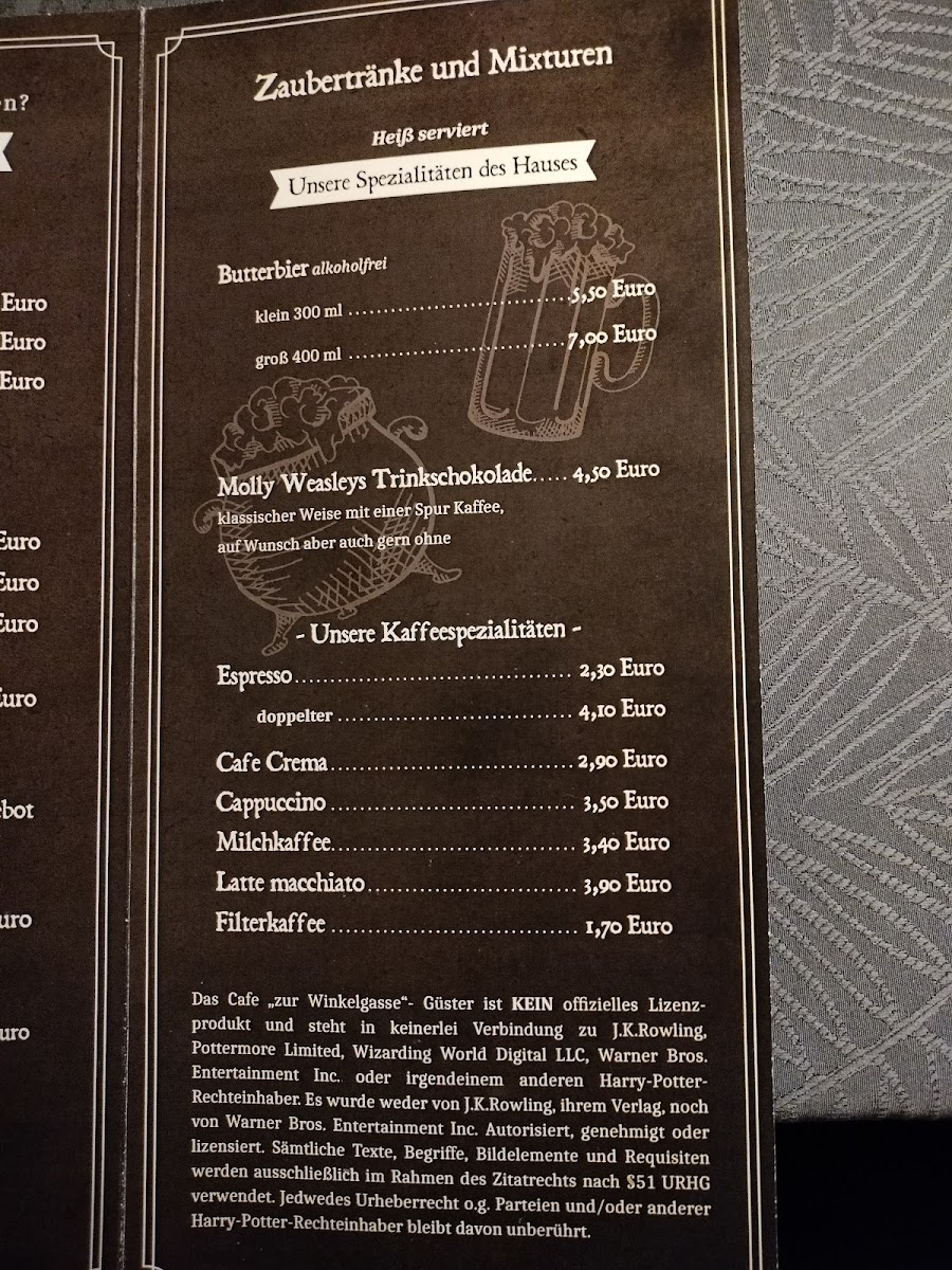 Drink options include a range of coffees, specialty drinks such as Butterbier, and beer choices like Hefeweizen. The bar selection caters to those looking for both non-alcoholic and alcoholic beverages.